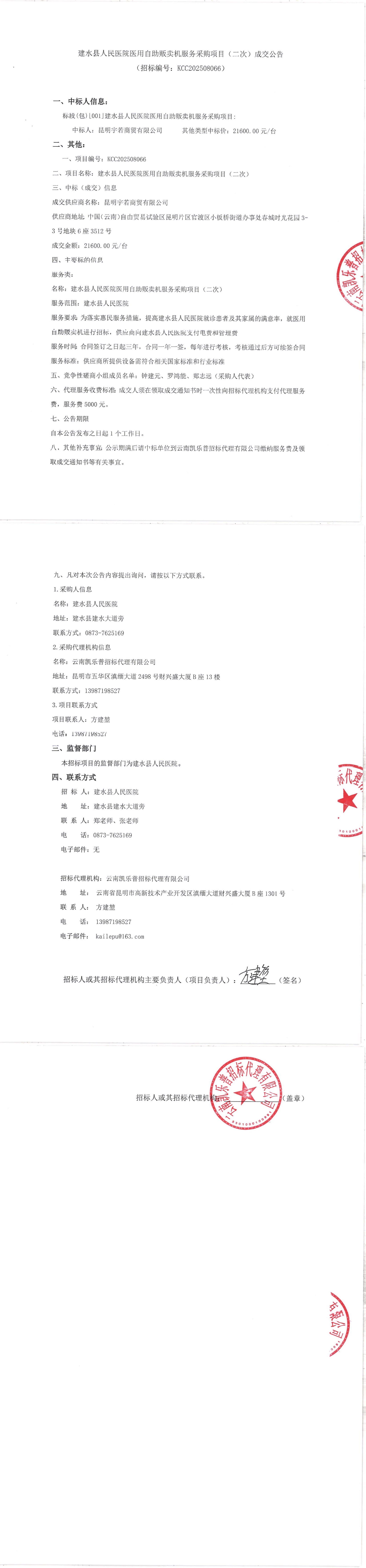 建水县人民医院医用自助贩卖机服务采购项目(二次)成交公告