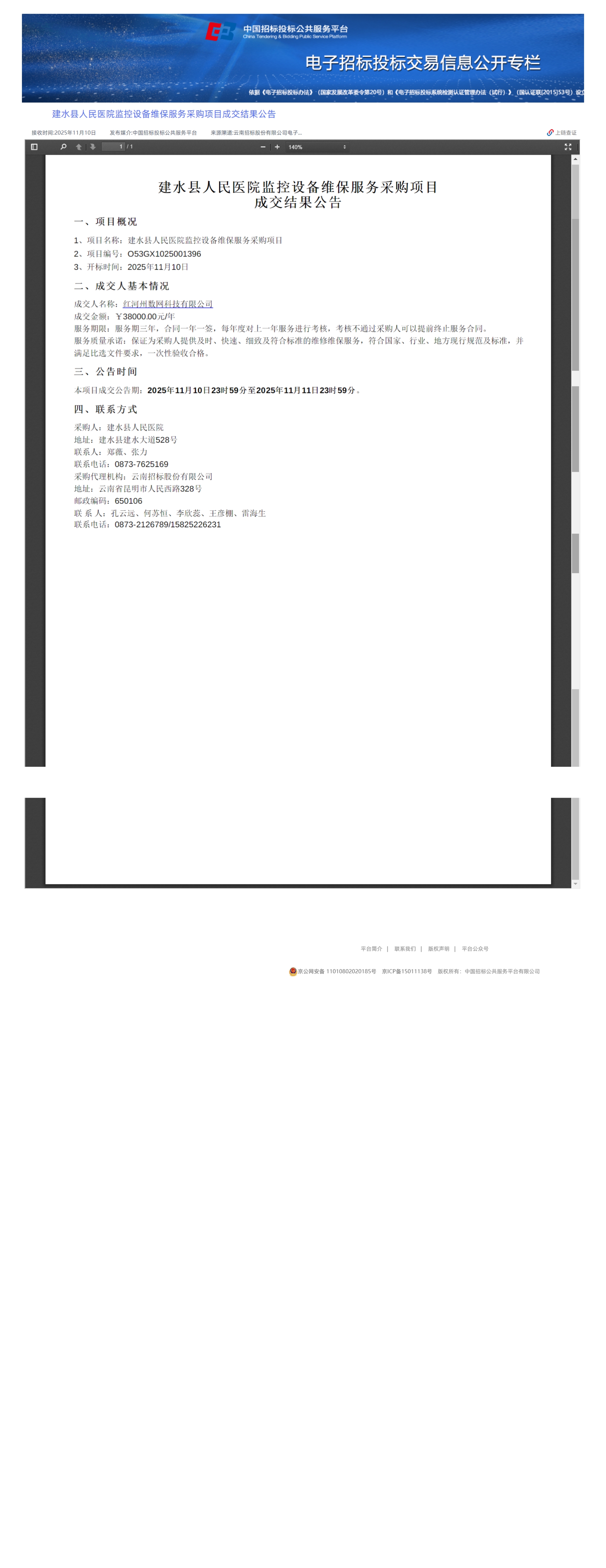建水县人民医院监控设备维保服务采购项目成交结果公告