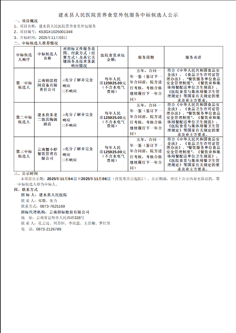 建水县人民医院营养食堂外包服务中标候选人公示