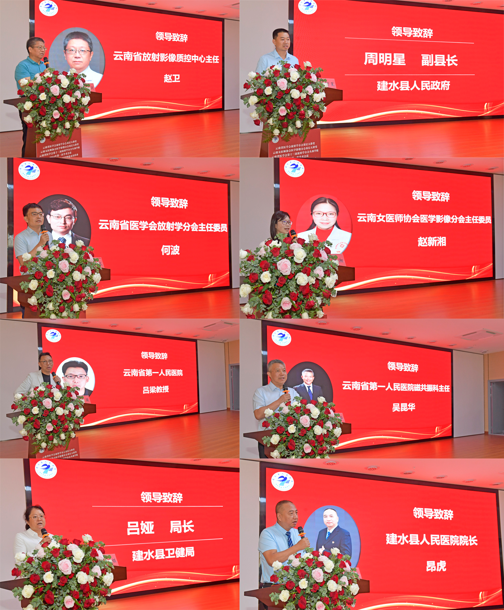 云南省放射影像质控中心主任赵卫教授、建水县人民政府副县长周明星,云南省医学会放射学分会主任委员、昆明医科大学第一附属医院何波教授,云南女医师协会医学影像分会主任委员、昆明医科大学第二附属医院赵新湘教授,云南省第一人民医院吕梁教授、云南省第一人民医院磁共振科主任吴昆华教授,建水县委卫健工委书记、县卫健局党组书记、局长吕娅,建水县人民医院党委副书记、院长昂虎等领导及专家出席并分别进行致辞。